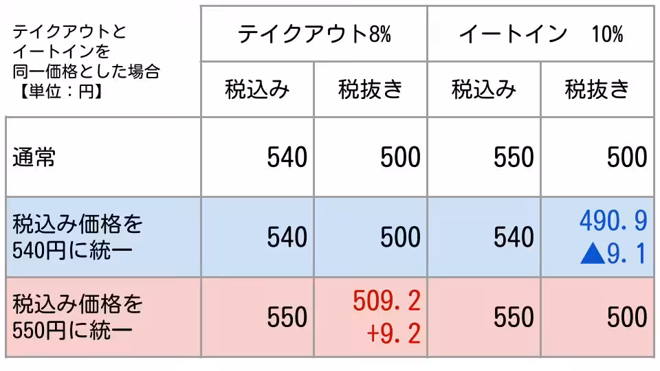 同じ商品について異なる価格設定をすることは事業者、消費者双方に混乱を招きかねません。これを防ぐ観点で、イートインとテイクアウトの税込価格を同一とすることを多くの大手外食チェーンが検討しています