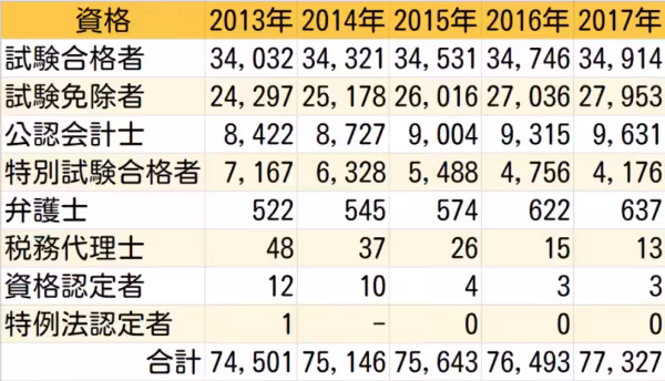 試験合格者数は横ばいで、免除と公認会計士が増加傾向となっています。このまま行くと近い将来、三つ巴みたいなことになったりするんだろうか。