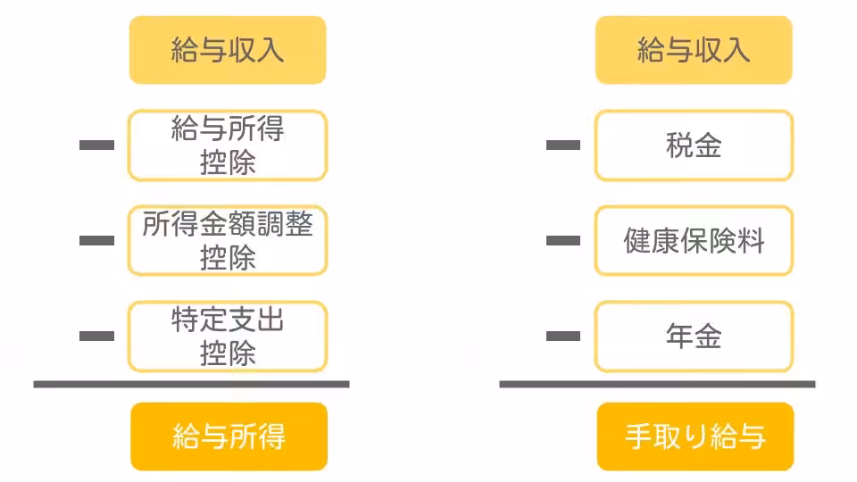 「給与所得」が税金計算のためだけにつかうものであるのに対し、「手取り給与」は実際に受け取る金額であるためです。