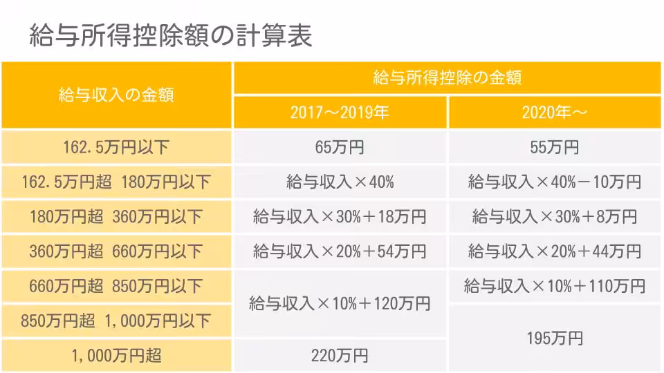 給与所得控除後の給与等の金額の表という別の表に給与収入を当てはめて、給与収入から給与所得控除を差し引いた金額を判定します。