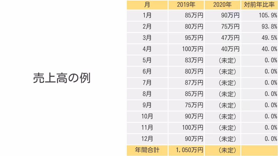 たとえば、2019年と2020年の売上の推移が以下のとおりであったとします。