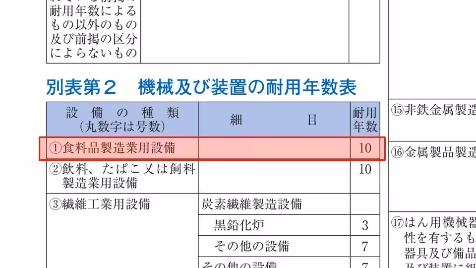 食料品製造工場で使う機器はデカッイのからチッチャイのまで様々あるだろうが、全部をひっくるめて10年で償却しましょうと。