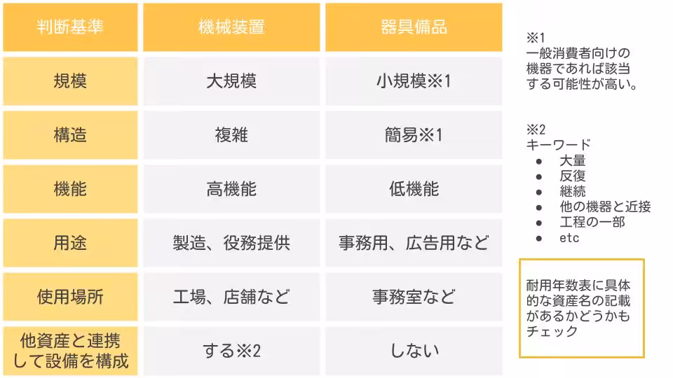 ご覧いただければ、機械装置と器具備品の区別がしやすくなりますよ。