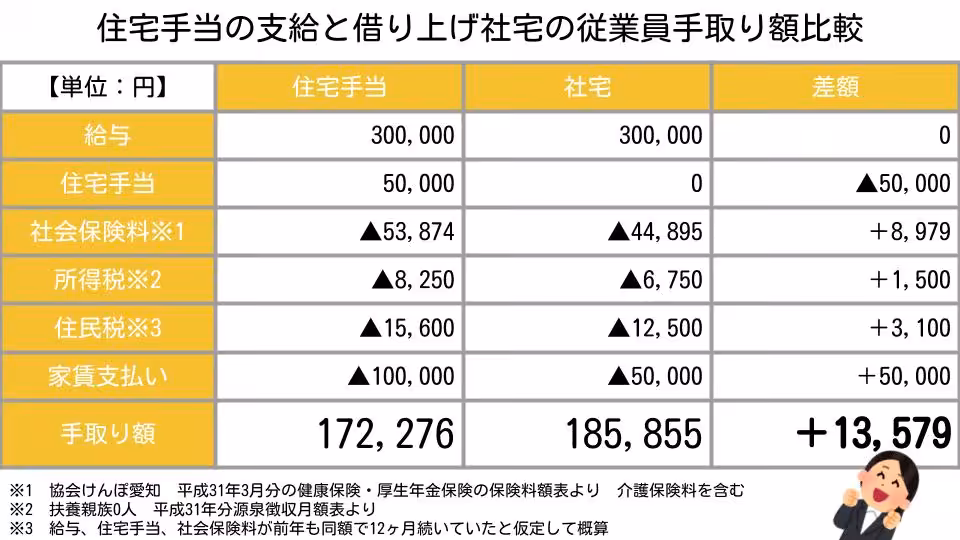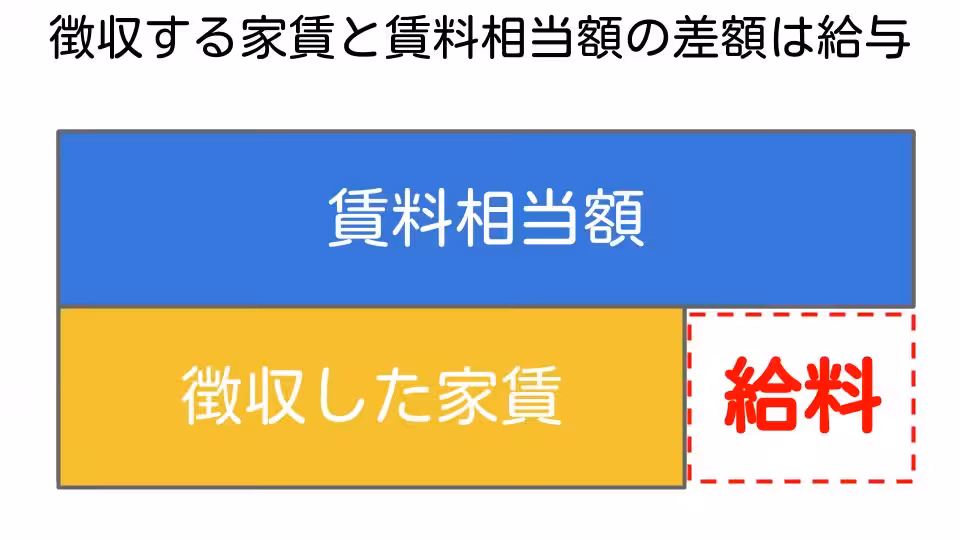 住宅手当は給与扱いされてしまいますので、そこには社会保険と税金がかかります。一方、10万円の部屋を5万円で借りられた差額5万円は給与扱いされません。