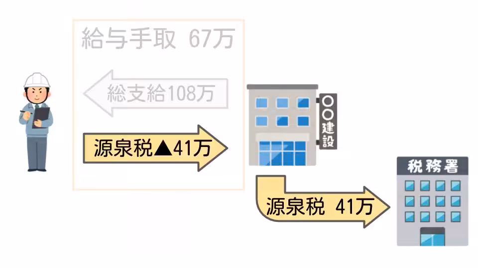 108万円の給与なら、108万円全部支払うわけではありません。410,748円の所得税を天引きした約67万円を支払います。※乙欄課税、108万円を一時払いした場合